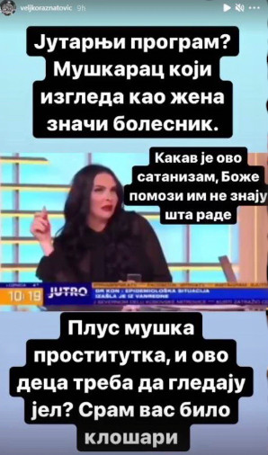 „Jutarnji program? Muškarac koji izgleda kao žena, znači bolesnik! Kakav je ovo satanizam, Bože oprosti im ne znaju šta rade. Plus muška prostitutka, i ovo deca treba da gledaju, je ’l? Sram vas bilo klošari“, napisao je Veljko tada na svom Instagramu, a ovu njegovu objavu su preneli mediji, a sada ju je Elektra prokomentarisala u „Vatrenom krštenju“: