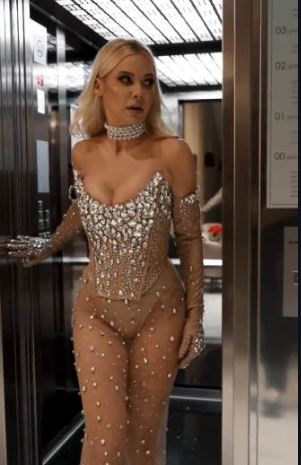 Haljina je bila ukrašena kristalima, a providna tkanina je otkrivala njene noge i veš u boji kože koji je nosila ispod nje.