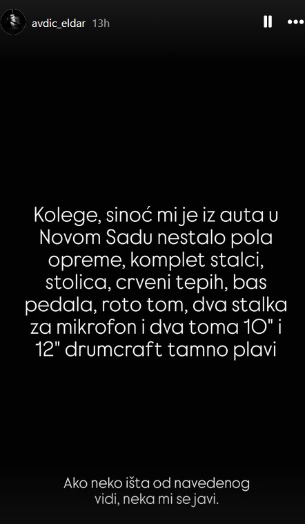 „Kolege, sinoć mi je iz auta u Novom Sadu nestalo pola opreme, komplet stalci, stolica, crveni tepih, bas pedala, roto tom, dva stalka za mikrofon i dra toma 10″ i 12″ drumcraft tamno plavi. Ako neko išta od navedenog vidi, neka mi se javi“, napisao je Eldar.