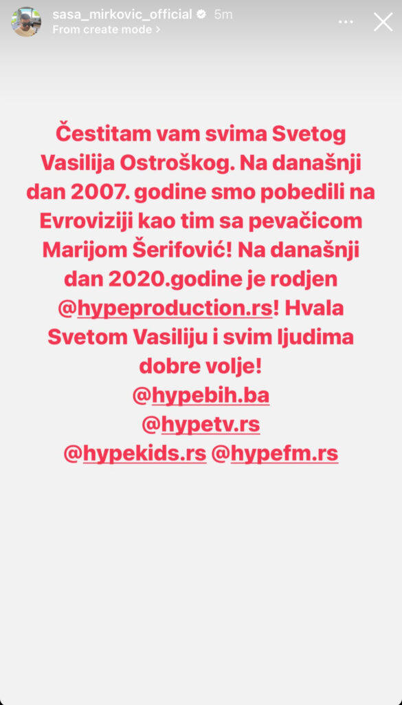 “Čestitam vam svima Svetog Vasilija Ostroškog. Na današnji dan 2007. godine smo pobedili na Evroviziji kao tim sa pevačicom Marijom Šerifović! Na današnji dan 2020.godine je rođen @hypeproduction.rs! Hvala Svetom Vasiliju i svim ljudima dobre volje!” napisao je Mirković.