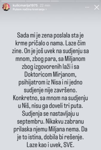 – Sada mi je žena poslala šta je krme pričalo o nama. Laže čim zine. On je još uvek na suđenju sa mnom zbog para, sa Miljanom zbog izgovorenih laži i sa doktoricom Mirjanom, psihijatrom iz Niša. I nijedno suđenje nije završeno. Konkretno, sa mnom na suđenju u Nišu nisu ga doveli tri puta. Suđenja se nastavljaju u septembru. Nikakvu zabranu prilaska njemu Miljana nema. Da je to istina, dobila bi rešenje. Laže kao i uvek, SVE – napisala je Marija Kulić na svom postu.
