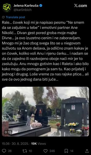 „Rale… čovek koji mi je napisao pesmu ‘Ne smem da se zaljubim u tebe’ i emotivni partner Ane Nikolić… Divan gest pored groba moje majke Divne… ja ovo izuzetno cenim i ne zaboravljam“, odmah je to naglasila Jelena.