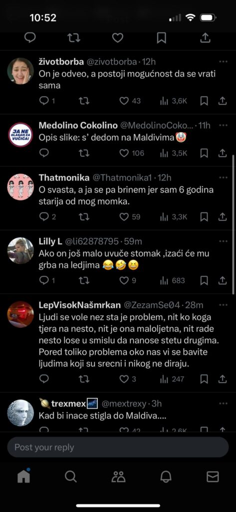 „Kad bi inače stigla do Maldiva….“, „On je odveo, a postoji mogućnost da se vrati sama…“, „Opis slike: Sa dedom na Maldivima“... Samo su neki od komentara, koji pljuju glumicu što je uplovila u vezu sa toliko starijim kolegom.