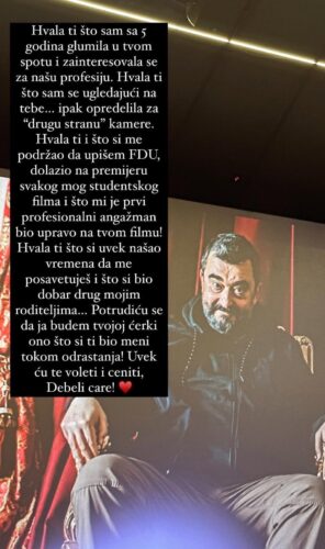 „Hvala ti što sam sa pet godina glumila u tvom spotu i zainteresovala se za našu profesiju. Hvala ti što sam se ugledala na tebe.. ipak opredelila na ‘drugu stranu’ kamere. Zahvalna sam na tome i što si me podržao da upišem FDU. Dolazio na premijeru svakog mog studentskog filma i što mi je prvi profesionalni angažman bio upravo na tvom filmu„, napisala je Jelena.