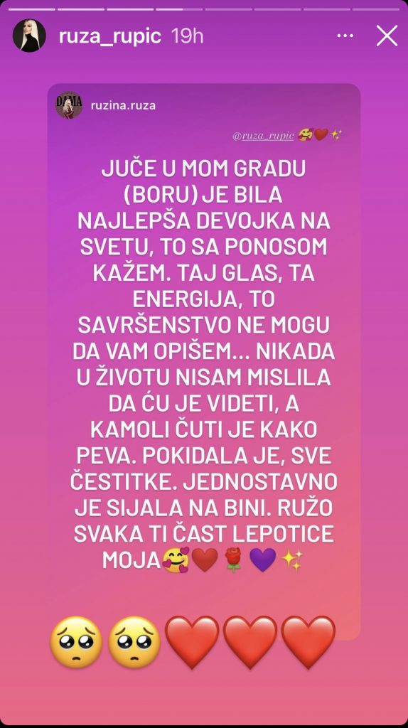 – Juče u kom gradu (Boru) je bila najlepša devojka na svetu, to sa ponosom kažem. Taj glas, ta energija, to savršenstvo ne mogu da vam opišem… Nikada u životu nisam mislila da ću je videti, a kamoli čuti je kako peva. Pokidala je, sve čestitke. Jednostavno je sijala na bini. Ružo svaka ti čast lepotice moja – napisala je devojka, inače fan popularne jutjuberke na svom Instagram nalogu uz pregršt emotikona srca.