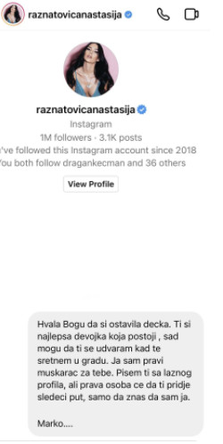 – Nije mi odgovorila i krvo mi je. Ja nisam neki manijak što saleće na Instagramu. Ozbiljan sam dečko i Anastasija mi se jako dopada. Lepa je, mila i želeo bih da je upoznam. Lajkovao sam joj sve slike. Neka mi se javi ako želi – poručio je on.