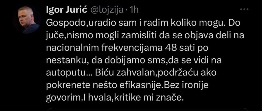 „Gospodo, uradio sam i radim koliko mogu. Do juče, nismo mogli zamisliti da se objava deli na nacionalnim frekfencijama 48 sati po nestanku, da dobijamo sms, da se vidi na autoputu… Biću zahvalan, podržaću ako pokrenete nešto efikasnije. Bez ironije govorim. I hvala, kritike mi znače“, napisao je Jurić svom X nalogu.