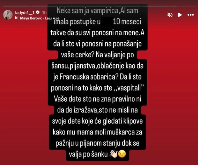 – Neka sam ja vampirica, ali sam imala postupke u rijalitiju deset meseci, takve da su svi ponosni na mene. A da li ste vi ponosni na ponašanje vaše ćerke? Na valjanje po šanki, pijanstva, oblačenje kao da je francuska sobarica? Da li ste ponosni na to kako ste „vaspitali“ Vaše dete što ne zna pravilno ni da se izražava, što ne misli na svoje dete koje će gledati klipove kako mu mama molim muškarca za pažnju u pijanom stanju dok se valja po šanku…