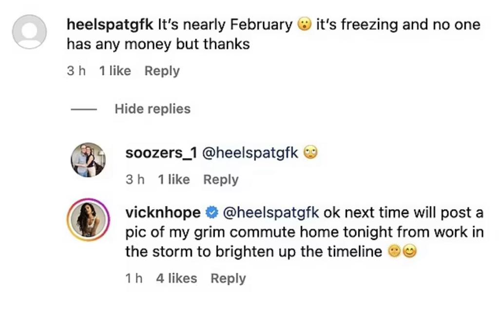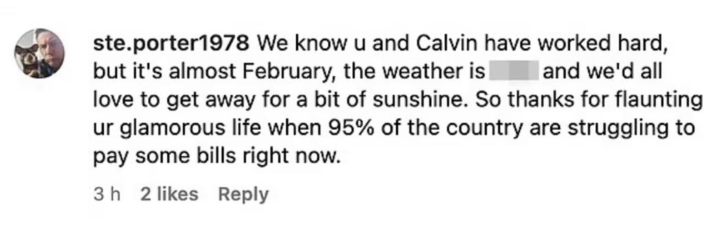 -Znamo da si ti i Kalvin naporno radili, ali već je februar, vreme je užasno, svi bismo voleli malo sunca. Hvala ti što pokazuješ svoj glamurozni život kad 95% zemlje trenutno pokušava platiti neke račune. – a na to je Vik odgovorila