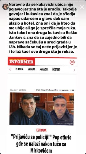 – Naravno da se kukavčki ubica nije pojavio jer zna šta je uradio. Takođe gov*ar i kukavica zna i da je s leđa napao udarcem u glavu dok sam ulazio u hotel. Zna on i da je hteo da me ubije, ali ga je sprečila moja ruka. Isto tako i ona druga kukavica Boško Janković zna da su zajedno bili da naprave sačekušu u sred grada u 13 časova. Nikada se taj neće prijaviti jer je i to laž kao i sve drugo što je rekao – napisao je Saša Mirković.