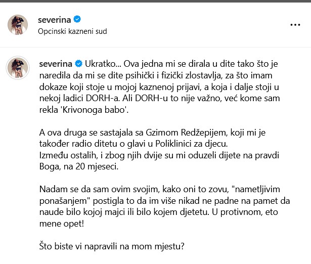 – Ukratko, ova jedna mi je dirala u dete tako što je naredila da mi se dete psihički i fizički zlostavlja, za šta imam dokaze koji stoje u mojoj krivičnoj prijavi, a koja i dalje stoji u nekoj fioci. Ali DORH-u to nije važno, već kome sam rekla „krivonoga babo“. A ova druga se sastajala sa Gzimom Redžepijem, koji mi je takođe radio detetu o glavi u Poliklinici za decu – započela je Severina, pa istakla da joj je dete oduzeto zbog njih dve: