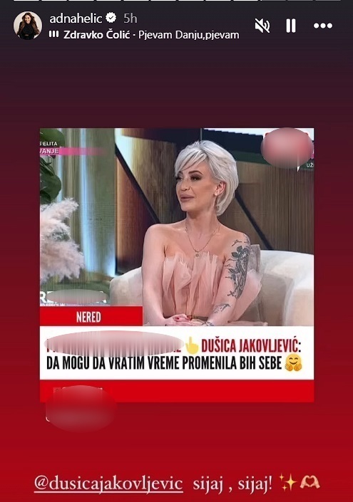 -Ona je podijelila objavu uz pesmu “Pjevam danju, pjevam noću”, koju izvodi Zdravko Čolić. Uz reči „Sijaj, sijaj“.