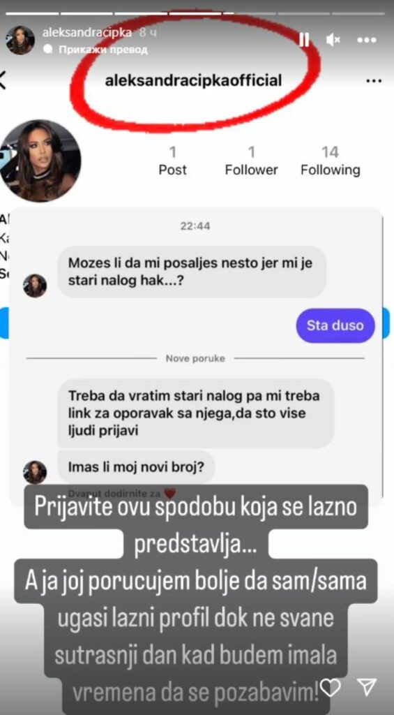 – Prijavite ovu spodobu koja se lažno predstavlja. A ja joj poručujem da sam/sama ugasi lažni profil dok ne svane sutrašnji dan, kad budem imala vremena da se pozabavim – napisala je Cipka na svom storiju.