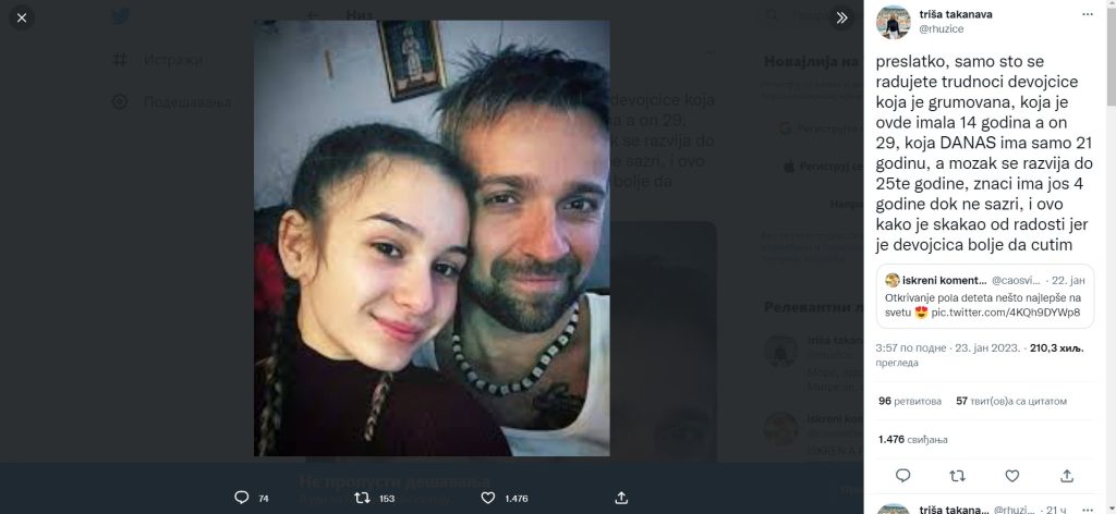 „Preslatko, samo što se radujete trudnoći devojčice koja je grumovana, koja je ovde imala 14 godina a on 29, koja danas ma samo 21 godinu, a mozak se razvija do 25. godine, znači ima jos 4 godine dok ne sazri, i ovo kako je skakao od radosti jer je devojčica bolje da ćutim.“