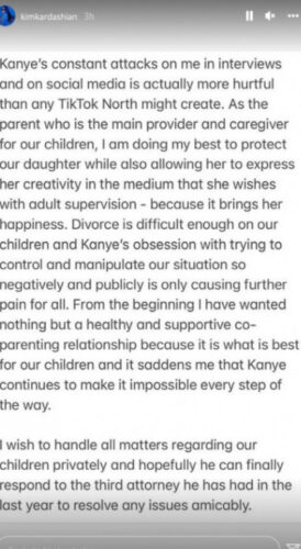 Prema sopstvenom priznanju, posebno ga boli to što sve što se piše „služi da postavi ljude na njenu stranu, a protiv oca Nort, Čikago, Sejna i Psalma“. Preko printskina njenog Instagram storija u kom se žali na njega, poručio je: