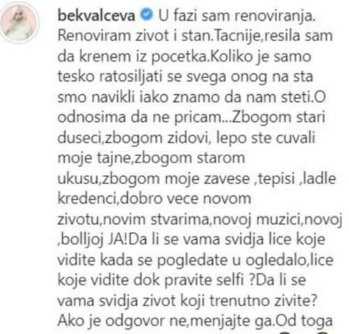 – U fazi sam renoviranja. Renoviram život i stan.Tačnije, rešila sam da krenem iz početka. Koliko je samo teško ratosiljati se svega onog na šta smo navikli iako znamo da nam šteti. O odnosima da ne pričam… Zbogom stari dušeci, zbogom zidovi, lepo ste čuvali moje tajne, zbogom starom ukusu, zbogom moje zavese, tepisi, ladle i kredenci, dobro veče novom životu, novim stvarima, novoj muzici, novoj, boljoj JA! Da li se vama sviđa lice koje vidite kada se pogledate u ogledalo, lice koje vidite dok pravite selfi? Da li se vama sviđa život koji trenutno živite? Ako je odgovor „ne“,menjajte ga. Od toga vas deli samo odluka – napisala je Nataša.