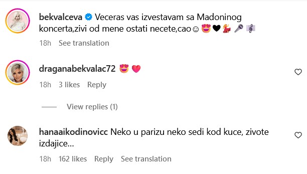 – Večeras vas izveštavam sa Madoninog koncerta, živi od mene nećete ostati. Ćao – napisala je Bekvalčeva u svojoj objavi.