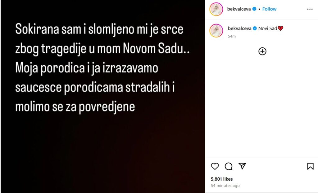 – Šokirana sam i slomljeno mi je srce zbog tragedije u Novom Sadu. Moja porodica i ja izražavamo saučešće porodicama stradalih i molimo se za povređene – napisala je Nataša Bekvalac.