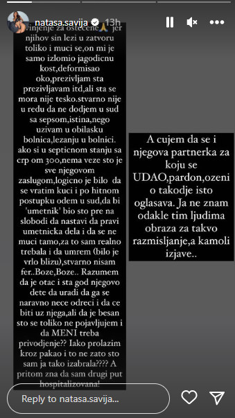 – Izvinjenje za oštećene jer njihov sin leži u zatvoru, muči se,samo mi je izlomio jagodičnu kost, deformisao oko, preživljavam šta preživljavam. Stvarno nije u redu da ne dođem u sud sa sepsom, već uživam u obilasku bolnica. Sa CRP 300 i sepsom verovatno bi bilo logično da se pojavim u sudu kako bi umetnik što pre bio na slobodi – navela je Šavija u svojoj objavi .