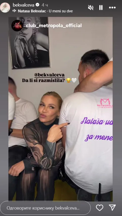 Ipak, najzanimljiviji detalj nije bio uočljiv na prvi pogled. Konobari su na leđima imali specijalnu poruku za Natašu, odnosno pitanje: „Nataša udaj se za mene?“. Tako su Bekvalčevu zaprosila četvorica, a pevačica je bila oduševljena originalnim iznenađenjem.
