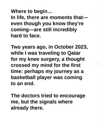 „Pre dve godine, u oktobru 2023, kada sam putovao u Katar na operaciju kolena, prvi put mi je pala misao: ‘možda je moje putovanje kao košarkaša završeno’. Lekari su pokušali da me ohrabre, ali znaci su već bili tu„, napisao je Papapetru na Instagramu.