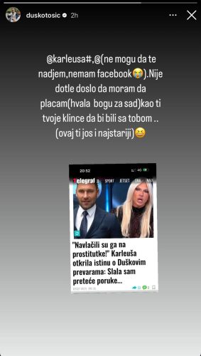 – Karleuša, ne mogu da te nadjem, nemam Fejsbuk. Nije dotle došlo da moram da plaćam (hvala Bogu, za sad), kao ti tvoje klince da bi bili sa tobom. Ovaj ti je još i najstariji.