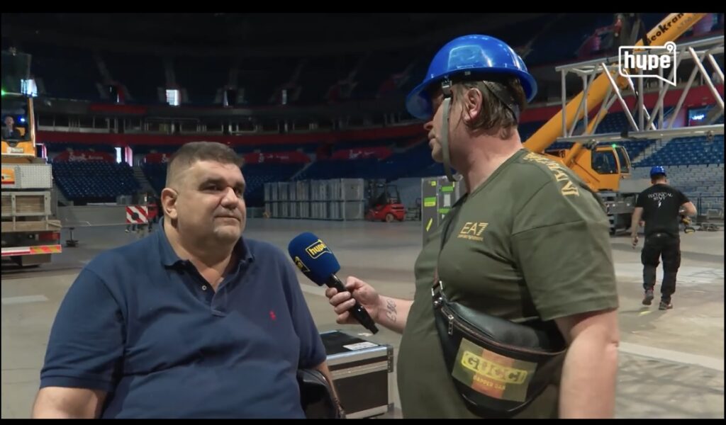 Memo je uspeo da uhvati nekoliko reči sa producentom, koji je izjavio da je veoma zadovoljan kako teku pripreme. Istakao je da je ispred Arene stiglo devet šlepera, a da na jednom delu bine koja se trenutno montira radi oko 160 ljudi.