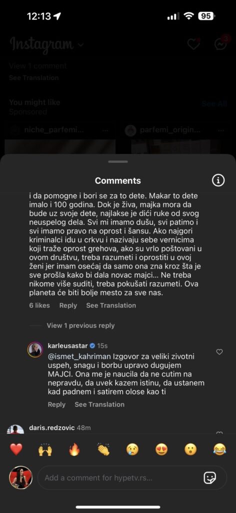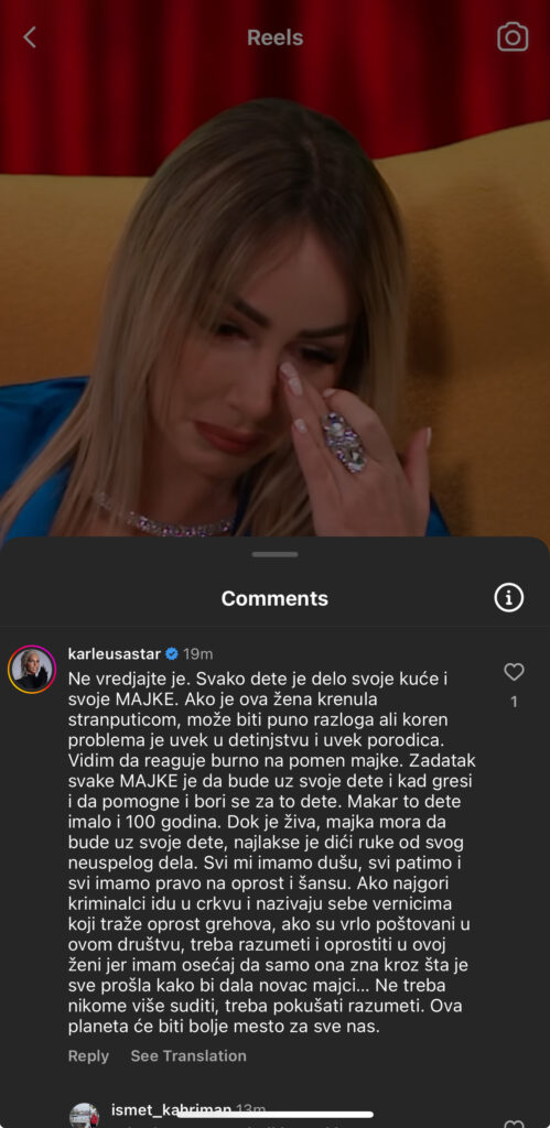 -Ne vredjajte je. Svako dete je delo svoje kuce isoje MAJKE. Ako je ova Zena krenula stranputicom, moze biti puno razloga ali koren problema je uvek u detinjstvu i uvek porodica.Vidim da reaguje burno na pomen majke. Zadatak svake MAJKE je da bude uz svoje dete i kad gresi i da pomogne i bori se za to dete. Makar to dete imalo i 100 godina. Dok je ziva, majka mora da bude uz soje dete, najlakse je dici ruke od svogneuspelog dela. Svi mi imamo dusu, svi patimo i svi imamo pravo na oprost i sansu. Ako najgori kriminalci idu u crkvu i nazivaju sebe vernicimakoji traze oprost grehova, ako su vrlo postovani u ovom drustvu, treba razumeti i oprostiti u ovoj Zeni jer imam osecaj da samo ona zna kroz sta je sve prosla kako bi dala novac majci… Ne treba nikome vise suditi, treba pokusati razumeti. Ova planeta ce biti bolje mesto za sve nas. – napisala je Karleuša.