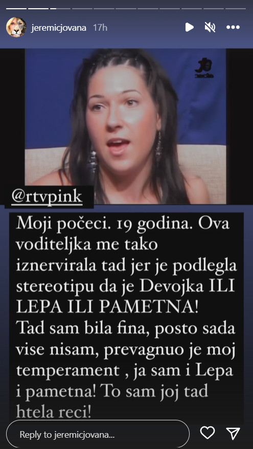 – Moji počeci. 19 godina. Ova voditeljka me je tako iznervirala tad jer je podlegla stereotipu da je devojka ILI LEPA ILI PAMETNA! Tad sam bila fina, pošto sada više nisam, prevagnuo je moj temperament, ja sam i lepa i pametna! To sam joj tad htela reći! – napisala je Jeremićeva na svom Instagram story-ju.