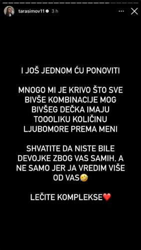 – I još jednom ću ponoviti. Mnogo mi je krivo što sve bivše kombinacije mog bivšeg dečka imaju toliku količinu ljubomore prema meni. Shvatite da niste bile devojke zbog vas samih. A ne samo jer ja vredim više od vas. Lečite komplekse – zaključuje Tara.