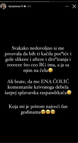Simova je najpre na njenoj prvoj Instagram priči objavila slikan ekran jednog od mnogobrojnih komentara, koji je Ena ostavljala Tari ispod fotografija.