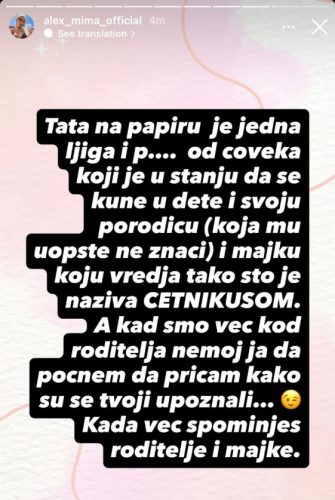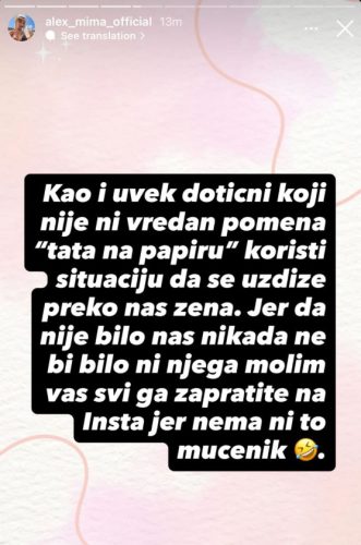 „Kao i uvek dotični koji nije ni vredan pomena „tata na papiru“ koristi situaciju da se uzdiže preko nas žena. Jer da nije bilo nas nikada ne bi bilo ni njega. Molim vas svi ga zapratite na Insta jer nema ni to mučenik“