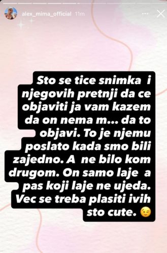 „Što se tiče snimaka i njegovih pretnji da će objaviti, ja vam kažem da on nema m… da to objavi. To je njemu poslato kada smo bili zajedno. A ne bilo kom drugom. On samo laje, a pas koji laje ne ujeda. Već se treba plašiti ovih što ćute“