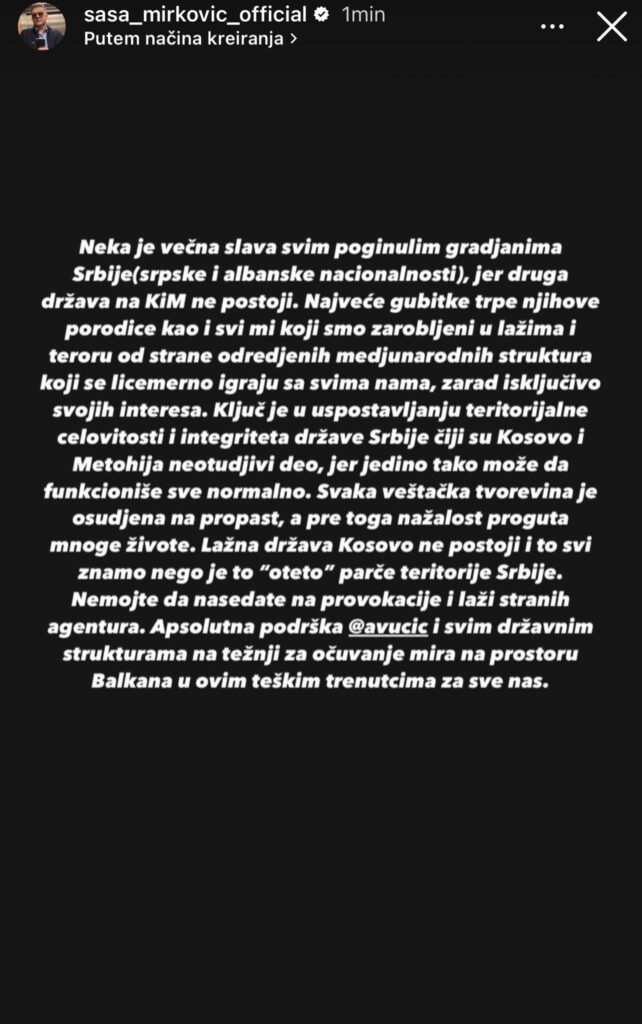 Direktor Hype produkcije Saša Mirković oglasio se na svom Instagram storiju povodom Dana žalosti koji je proglašen u Srbiji zbog trojice Srba na Kosovu i Metohiji koje je ubila tzv. kosovska policija.