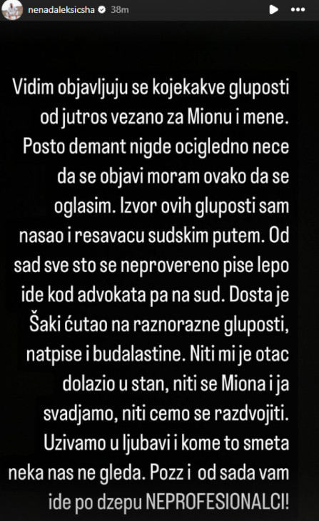 – Vidim objavljuju se kojekakve gluposti od jutros, vezano za Mionu i mene. Pošto demant nigde očigledno neće da se objavi, moram ovako da se oglasim. Izvor ovih gluposti sam našao i rešavaću sudskim putem. Od sad sve što se neprovereno piše, lepo ide kod advokata, pa na sud. Dosta je Šaki ćutao na raznorazne gluposti, natpise i budalaštine. Niti mi je otac dolazio u stan, niti se Miona i ja svađamo, niti ćemo se razdvojiti. Uživamo u ljubavi i kome to smeta neka nas ne gleda. Pozz i od sada vam ide po džepu neprofesionalci! – besno je poručio Nenad putem pomenute mreže.