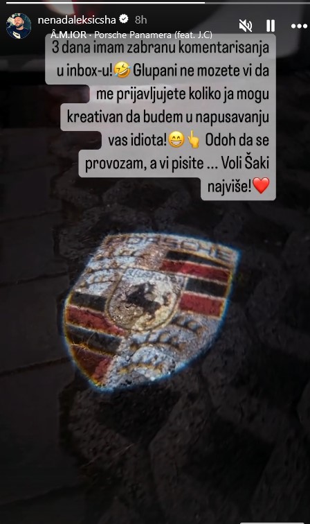 – Tri dana imam zabranu komentarisanja u inboksu. Glupani, ne možete vi da me prijavljujete koliko ja mogu da budem kreativan u napušavanju vas idiota. Odoh da se provozam, a vi pišite. Voli Šaki najviše – napisao je na pomenutoj mreži.