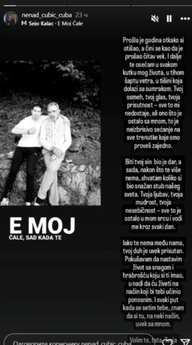 – Prošla je godina otkako sxi otišao a čini se kao da je prošao čitav vek. I dalje te osećam u svakom kutku mog života, u tihom šapatu vetra i tišini koaj dolazi sa sumrakom. Tvoj osmeh, tvoj glas, tvoja prisutnost – sve to mi nedostaje, ali ono što je ostalo sa mnom, to je neizbrisivo sećanje na sve trenutke koje smo proveli zajedno. napisao je Ćuba pa je dodao:
