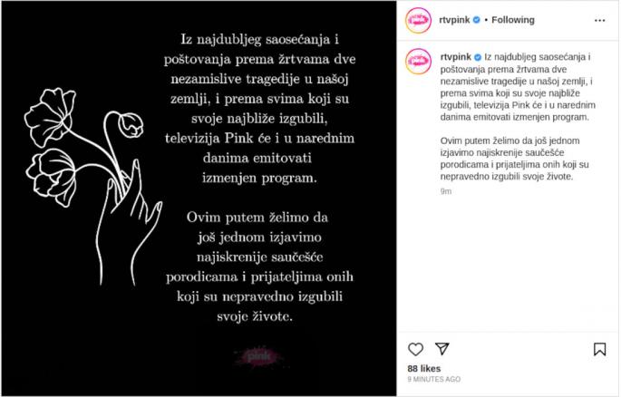 – Iz najdubljeg saosećanja i poštovanja prema žrtvama dve nezamislive tragedije u našoj zemlji, i prema svima koji su svoje najbliže izgubili, televizija Pink će i u narednim danima emitovati izmenjen program. Ovim putem želimo da još jednom izjavimo najiskrenije saučešće porodicama i prijateljima onih koji su nepravedno izgubili svoje živote – saopštili su sa televizije Pink.