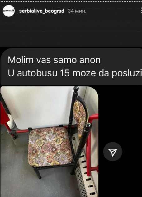 Na beogradskim Instagram stranicama pojavila se fotografija iz gradskog autobusa na liniji 15 u kome se ni manje ni više nalazi stolica koja je navodno za sedenje.