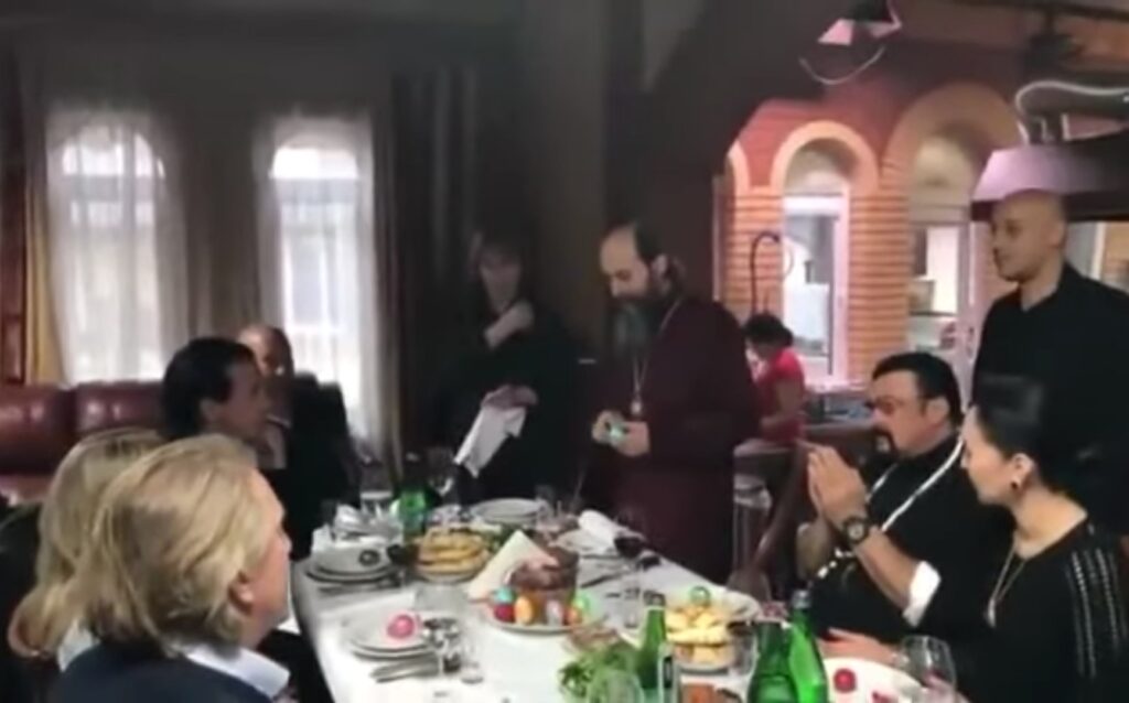 A očigledno vaskršnji ručak je upriličio svojim prisustvom ruski sveštenik koji je za to vreme pevao tropar (himnu) Vaskrsa.