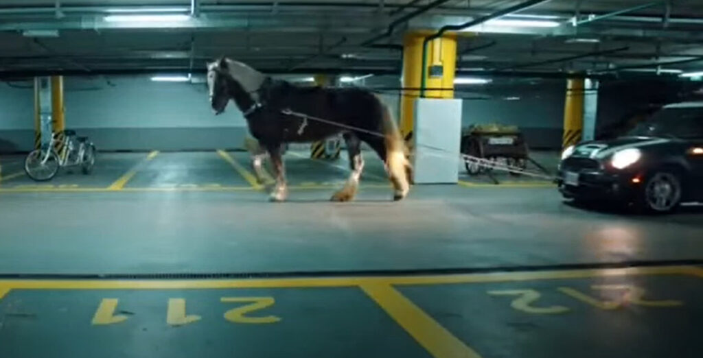 Protagonista snimka, mladić, seda za volan automobila, ali ne može da izađe sa parkinga jer je rezervoar za gorivo prazan. U kolima ima sena. Uzdahnuvši, čovek otvara otvor na krovu, ustaje i podiže uzde.