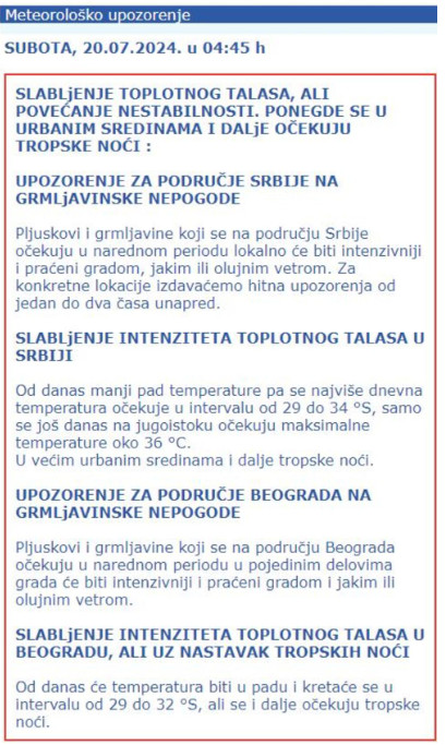 RHMZ je upozorio da se i narednih dana u Srbiji očekuju pljuskovi i grmljavina lokalno uz grad, jak ili olujni vetar, i da će za te lokacije izdavati hitna upozorenja jedan do dva časa unapred.