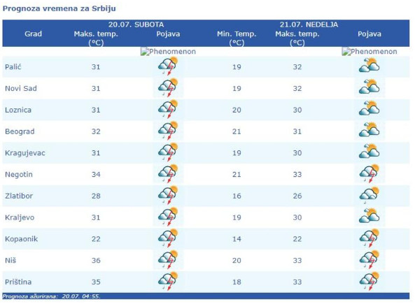 U Beogradu će biti promenljivo oblačno i malo svežije nego u petak, ali sparno i nestabilno, s pljuskovima i grmljavinom, češćim popodne i uveče, koji u pojedinim delovima grada mogu biti intenziviji, praćeni gradom i jakim ili olujnim vetrom. Duvaće slab do umeren istočni vetar. Jutarnja od 22 do 24 stepena, a najviša dnevna oko 32 stepena.