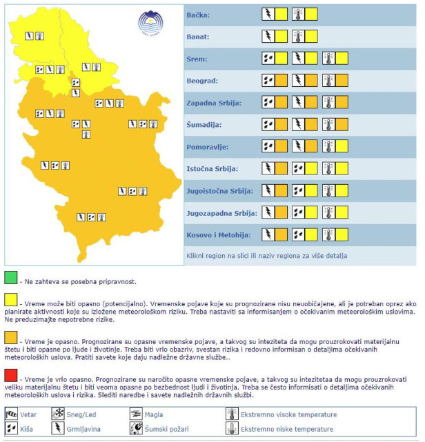 U većem delu Srbije danas je na snazi narandžasti meteo alarm zbog grmljavine, u nekim delovim i zbog kiše, ali i visoke temperature. U Bačkoj, Banatu i Sremu na snazi je žuto upozorenje.