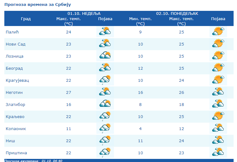 Od sredine dana suvo, uz postepeno smanjenje oblačnosti. Vetar slab i umeren severozapadni. Najniža temperatura od 13 do 16 stepeni, a najviša dnevna oko 22 stepena.