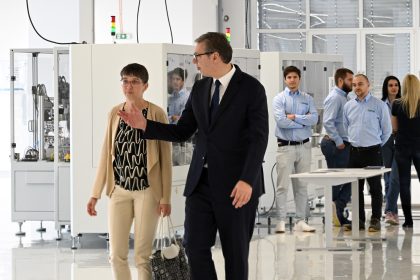 Predsednik Srbije Aleksandar Vučić prisustvuje otvaranju nove fabrike nemačke kompanije Milbauer za proizvodnju biometrijskih dokumenata uz primenu veštačke inteligencije i…