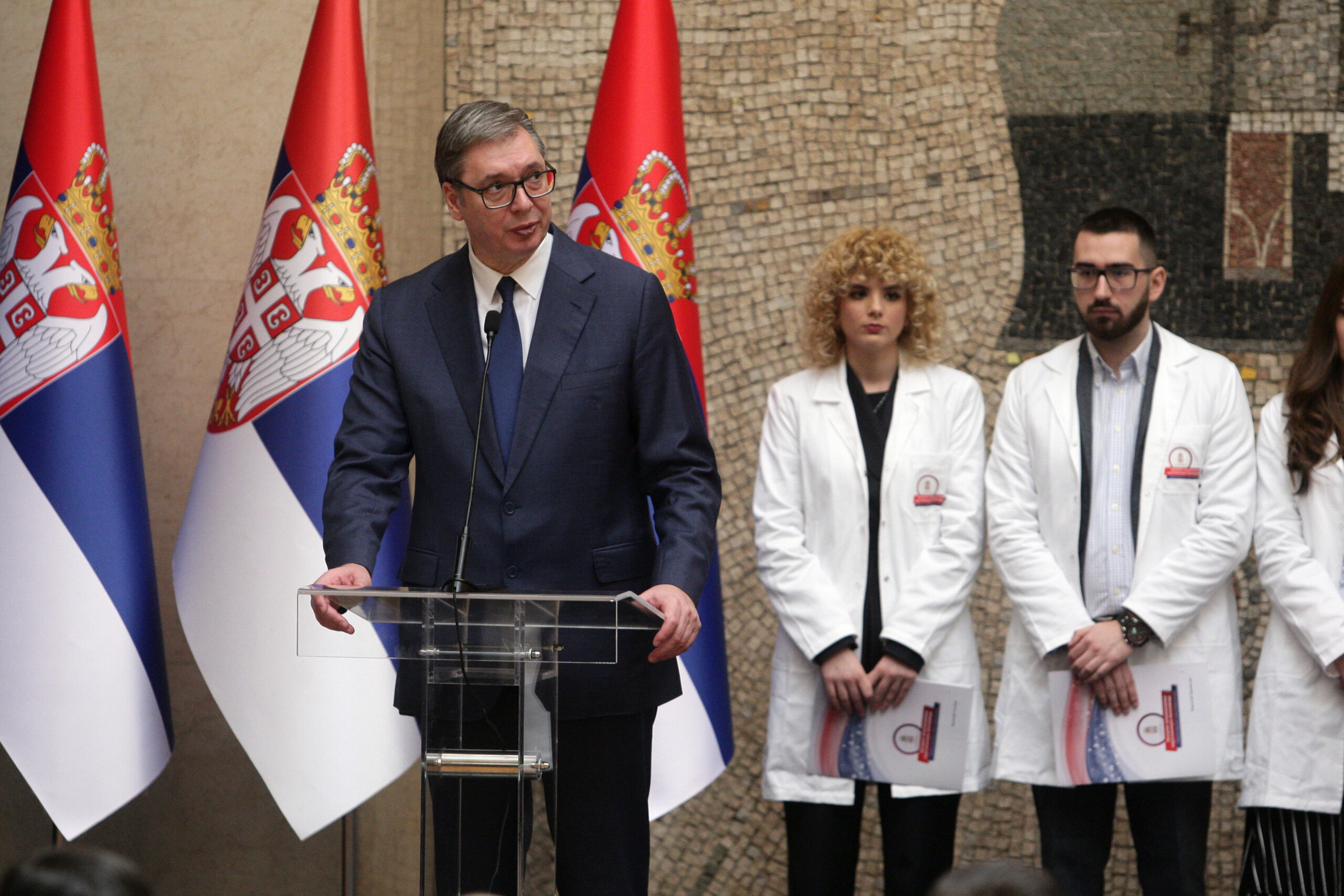 .Predsednik Vučić sa studentima i đacima Predsednik Srbije Aleksandar Vučić prisustvuje svečanom prijemu dodele ugovora o radu najboljim studentima medicinskih…