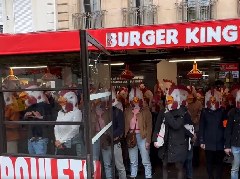 Aktivisti grupe za zaštitu životinja upali su sa maskama i u kostimima kokošaka u Burger King u Parizu, osuđujući uslove…
