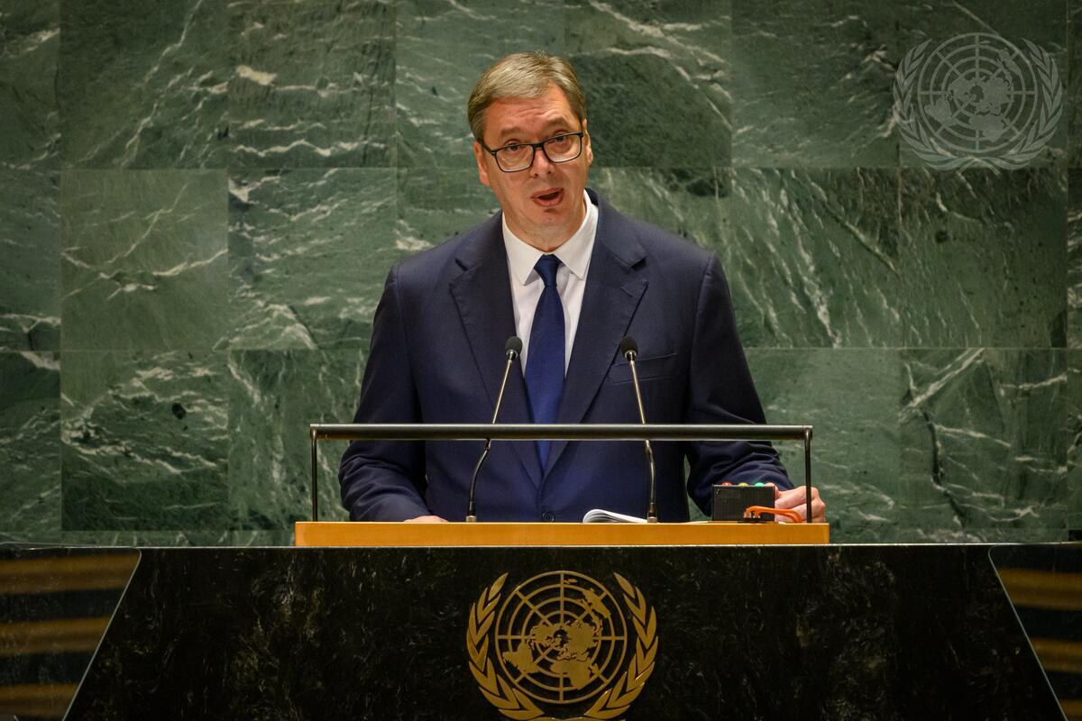 VUČIĆEVO PITANJE ODZVANJA SEDNICOM UN Predsednik Srbije Aleksandar Vučić govori na generalnoj debati 79. zasedanja Generalne skupštine. Ujedinjenih nacija (GS…