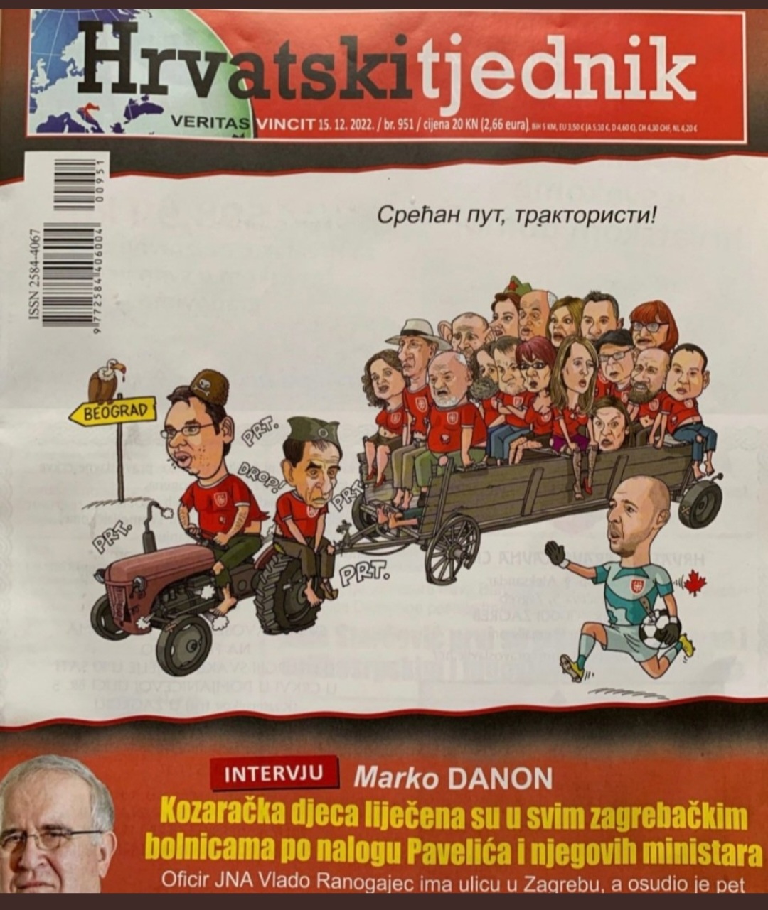 "Hrvatski tjednik" je objavio skandaloznu naslovnu stranu. Naime, na naslovnoj strani su stavili karikaturu uz čirilični natpis "Srećan put, traktoristi"…